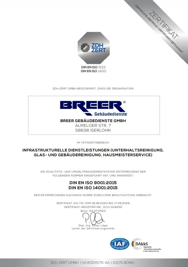 Unser Unternehmen ist nach DIN ISO 9001:2015 und DIN ISO 14001:2015 zertifiziert und erfüllt damit höchste Anforderungen an Qualitätsmanagement und Umweltmanagement. Durch die kontinuierliche Verbesserung unserer Prozesse garantieren wir höchste Qualität, Nachhaltigkeit und Kundenzufriedenheit. Unsere ISO-Zertifizierungen bestätigen unser Engagement für effiziente, umweltbewusste und zukunftsorientierte Unternehmensführung.